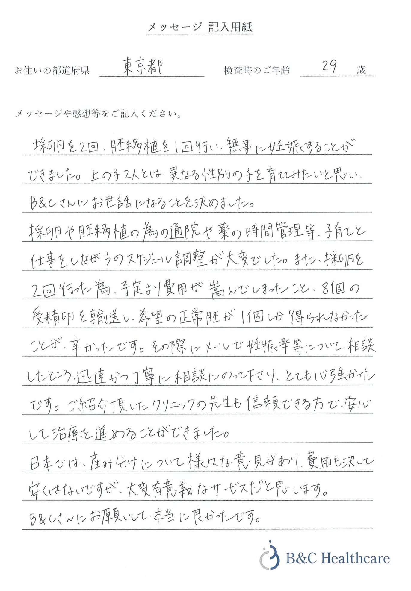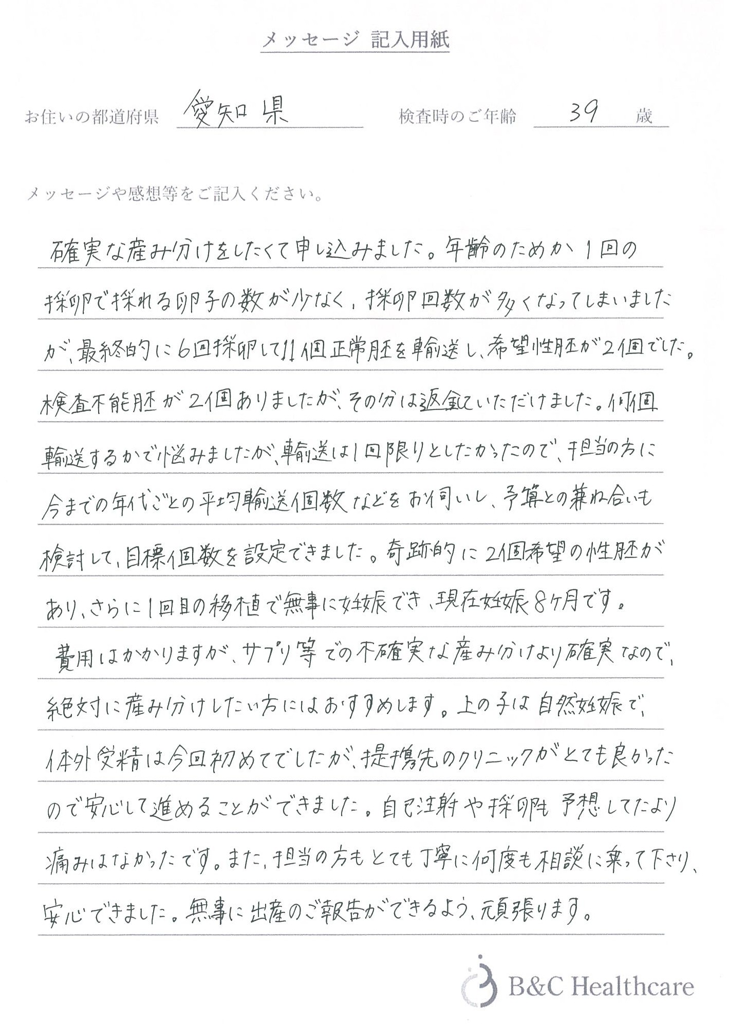 希望の性別の正常胚が1個しか得られませんでしたが、その後クリニックの先生と相談し、モザイク胚返送という異例対応を頂いた際も、料金提示含めて遺伝カウンセラーの方の紹介等、とても信頼かつ安心できる対応を頂き、大変感謝しております。